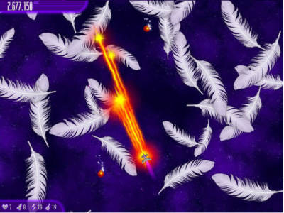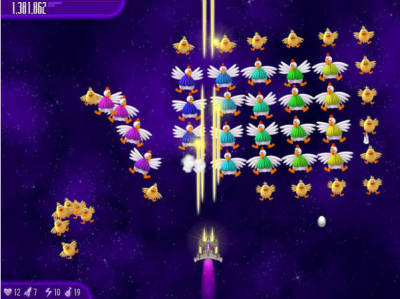 小鸡入侵者4:终极煎蛋是InterAction发行的此系列第4部飞行射击游戏,游戏中玩家将驾驶超级战机与许多的怪鸡对抗。游戏有点类似小蜜蜂的射击游戏。与小蜜蜂不同的是,本游戏敌人出现的位置变化较多。游戏进行当中,除了与怪鸡作战之外,还要躲避众多陨石的攻击。这些陨石掉落速度很快,而且数量众多,一时并无法全部清除,所以如何有效躲避是本游戏的一个重要技巧。在猎杀怪鸡的时候,有时会有"天上掉下来的礼物",玩家接到礼物之后,武力将可以增强,更有效率地对抗敌人。游戏以比较搞笑甚至恶搞的敌人出现,让玩家在奋战至于也甚感幽默。
