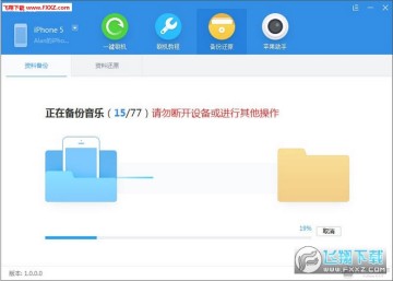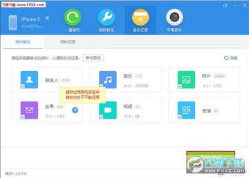(1)连接设备成功后点击“备份还原”按钮进入资料备份页面,默认选中所有备份选项,需要注意的是如果刷机前设备已越狱,则相应的越狱应用刷机后不能还原。