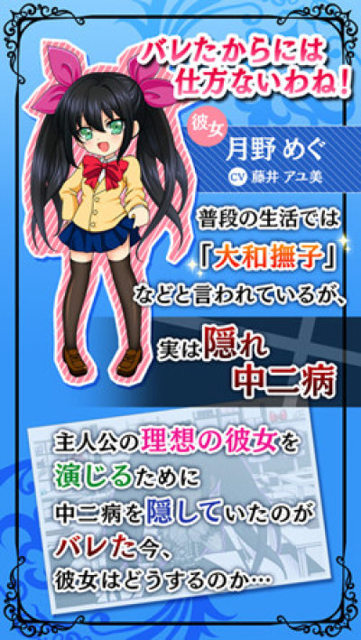 玩家扮演一名普通的男子高中生,有一个看上去是大和抚子一般的可爱女友。但实际上对方已经是晚期中二病患者,为了拯救女友,玩家要帮助女友进行改造。玩家需要将她房间中的各种中二道具全部收走,让她的中二值不断下降,直到恢复正常。