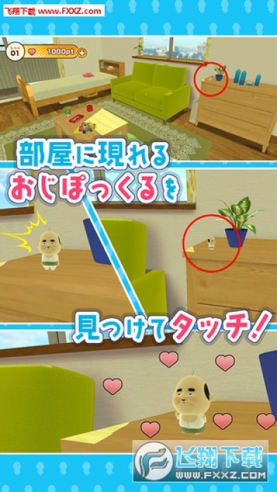 利用手指触碰滑动,就可以转换视角,桌子底下、椅子底下、化妆台上都可能是欧吉桑出现的地点,别忘了多加注意。抓到小欧吉桑之后,记得要用手指去触摸(收服?)他,收集到欧吉桑后会得到爱心点数,可以拿来解锁更新的欧吉桑哦!