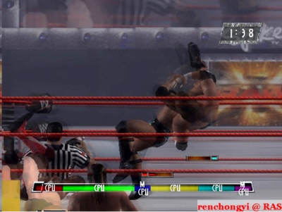 wwe美国职业摔角中有不同的比赛类型可供选择,其中包括一对一比赛、职业性摔跤(两人一组)、龙卷风、三项全能、可致人于死地的四向赛、混战、障碍赛、淘汰式锦标赛等等。 其中大多数都是标准比赛,有一些需要做一点解释。“三项全能”比赛指的是将三个摔角手互相攻击,不过你只要打倒其中一个摔跤手,就可以赢得比赛,这其实蛮难的,因为除了你之外,另外两个摔跤手不是由计算机控制,就是由其它玩家控制,他们将会不停地攻击你。“可致人于死地的四向赛”跟“三项全能”比较接近,只不过这次上场的是四个选手,只要一个摔跤手被打倒,他就必须离开竞技场。“障碍赛”指的是玩家必须打倒其它两个或三个摔跤手,他们常常会联手攻击你。你可以改变某些比赛的规则,提高比赛的难度——你可以使用各式各样的武器,将对手抛下赛台——但是在后台或是竞技场的外面,你不能攻击对手。除此之外,这部游戏中还有一种比赛选择,有些类似锦标赛和洲际比赛的性质,玩家需要打倒几个选手。令人遗憾的是,这种模式没有任何故事情节,在每场锦标赛的结尾时你所要对付的选手都不堪一击。这部游戏中真正的摔跤比赛节奏比较慢,甚至于大多数基本的动作执行起来都有点困难。你必须使用各种各样的招数不停地攻击你的敌人,直到屏幕下方的动力指示条上代表你的那个部分开始闪光。如果屏幕开始闪光,那就说明你可以使用最后一招,然后就可以赢得胜利了。不过,同样的招数不能重复使用,因为你的动力指示条将会慢慢的衰竭,你不能一味的用拳头揍敌人,也不用一直用脚踢敌人,因为你控制的选手的持久力也会慢慢下降,到最后将无力反抗敌人的攻击了。使用不同的招数攻击敌人,并不是件容易的事,因为计算机选手常常能避开你的攻击。