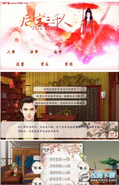 当然游戏有很多有意思的设定,有很多隐藏剧情,一旦某项好感值足够,就能进入隐藏剧情(说不定跟皇子或者妃嫔私奔哦)游戏画风古典优美,首先记住存档,面对问题机智应对后宫如职场,大胆的用自己的智慧征服这个游戏吧!