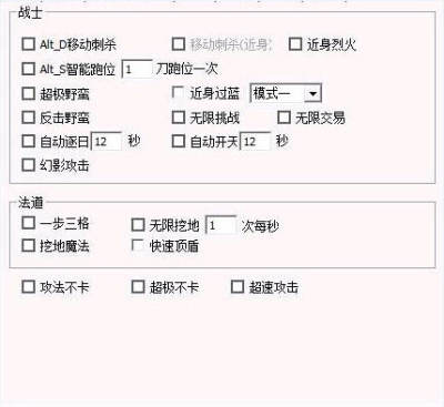 战士基本功能:近身烈火、隔位刺杀、强制近身、智能攻击(田字、随机)、攻击暗杀、锁定目标、开启攻击变色、幻影攻击、幻影移动、过攻击超速、多倍攻击(可自行设置)、近身过蓝、无限刀(按“~”键之后自动砍,超级无敌)、攻击野蛮、去提示框等