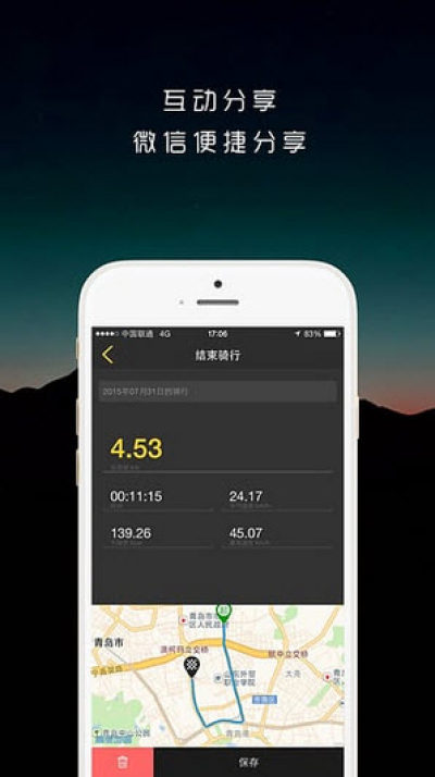 4.互动分享:与微信连接,一键分享,展示骑行状况,即时互动交流。