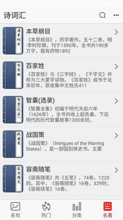 这款诗词汇app是一个帮助大家学习诗词的手机应用,其几乎收录了中国历史上所有的经典诗词,全部都支持免费在线阅读,可以很好地提升你的文学水平与素养,平时对中国古诗词感兴趣的朋友可以在这里免费下载哟,相信你一定会喜欢的!