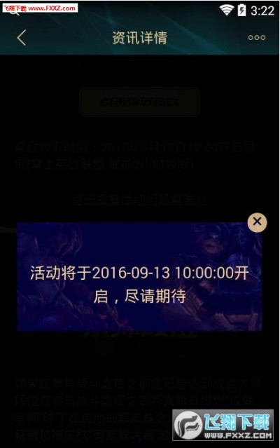 皮肤奖励长达7天可以领取,时间为9月13日12:00~9月19日23:59,掌上英雄联盟可以提前2个小时领奖;