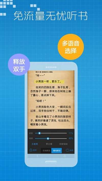 高品质离线免流量朗读插件,实现随时随地解放双眼,无忧听书,并有多种语音可选。