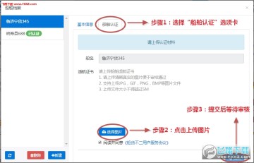 点击界面中的“船舶中心”,选择“船舶认证”选项卡,按要求上传材料,提交后等待审核通过即可。