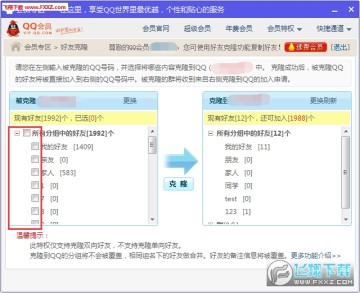 第三步:在被克隆QQ里选择想要克隆的内容:您可以自由选择要克隆的内容,可以单独克隆某个群或者某个好友分组或分组里的单个或多个好友,只需在页面左边被克隆号码中勾上要克隆的内容即可。