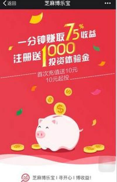 芝麻博乐宝注册就会送1000元体验费和10元现金劵,芝麻博乐宝app——让你一分钟赚取75%的收益,是一款全新的手机投资理财软件哦!