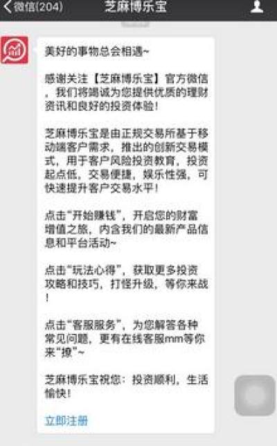 芝麻博乐宝app是一个微交易平台,不知道哪款理财平台收益高的小伙伴们可以试试芝麻博乐宝软件哦,平台交易正规公正,收益高,目前暂无芝麻博乐宝app下载地址,用户关注其公众号即可注册账户。