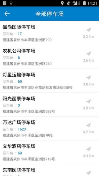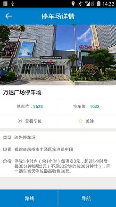 2.精准显示目的地周边停车场位置,实时剩余车位,类型和收费详情;