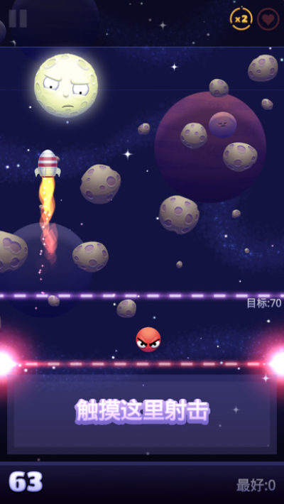 《shoot the moon游戏安卓版》是一款以攻击月亮为主要内容的休闲类手机游戏,游戏以太空为主要的游戏背景,玩家在游戏中要攻击这个高声唱歌的月亮!冲它发射火箭,加入这场奇妙的太空之旅!变幻莫测的太空星球,让你感受最独特的射击玩法!喜欢的玩家赶紧下载体验吧!