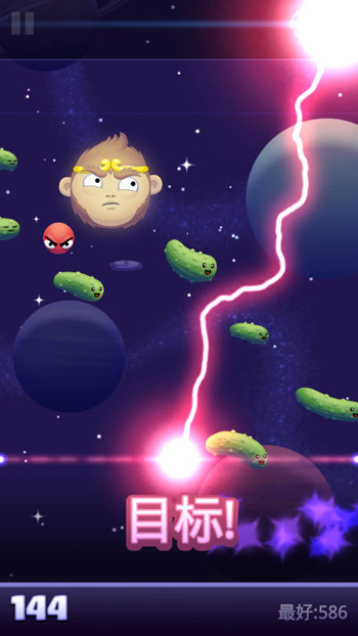 游戏整体都非常诙谐逗趣,玩家所扮演的角色很简单,就是一个发射兵,月亮会在画面中随意游走,我们要做的就是点击屏幕来发射火箭,指哪打哪儿,不过射击路线自始自终都是垂直的不会反弹。也就是说为了射击月亮,就必须将提前行动轨迹考虑进去,这在众多定点射击游戏中属于比较传统的设定了。