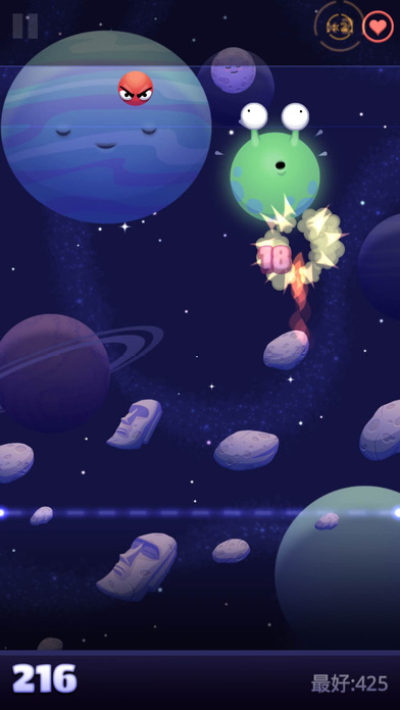 进入游戏后,我就已经被月亮时而得意时而挑衅的表情逗乐了。在我们的印象里月亮应该是个宁静优美的形象,而在这款游戏中,月亮就显得有些调皮了。它在深蓝色的星空背景中不断地上蹿下跳四处游走,不仅会一边张着嘴巴哼着小曲儿,还一边向你挤眉弄眼的挑衅,我们要做的就是发射火箭炮给于它沉重打击让它彻底闭嘴。游戏画面真是十分趣味生动,通过观察月亮的表情可以得知它的心情指数。