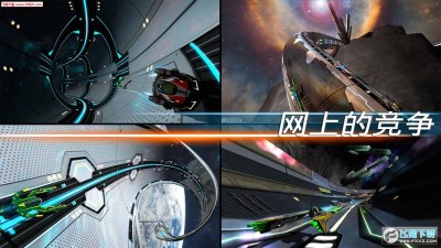 这是一款背景设定在未来太空的竞速游戏,周围的环境几乎是漆黑一片,仅有点点星光隐约可见。游戏中的飞船细节刻画十分细致,而当飞船进入高速状态时,玩家还会看到周围的环境变得更加模糊,若不小心撞到赛道边的栏杆之后,将会迸发出激烈的火花。