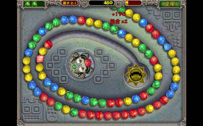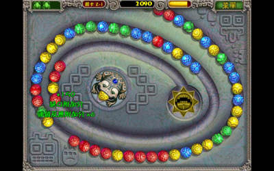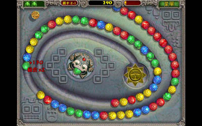祖玛传奇 玩家是一直石头做的青蛙,通过突出各种颜色的小球,射向轨道滚动着相同颜色的小球。颜色