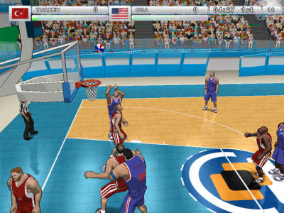 动画渲染画面风格,在游戏容量不大的情况下,让角色更显圆润真实。游戏中的视角和比赛视角十分接近,人物也各具特色,真实丰满,还有丰富的动作画面特效。 游戏音乐采用动感十足的运动音乐,配合篮球的节奏,让比赛场面更显火爆,音乐和动作的结合也促进了比赛的观赏性。