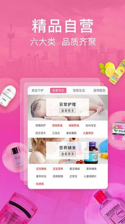 美妆护肤、婴童孕妈、食品保健、家居日用、服装鞋包......数千款商品涵盖热门进口商品。每天上新,及时同步全球时尚。