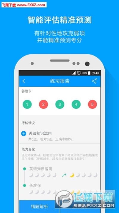 4、智能评估精准预测:每次练习完即可对答案,系统根据你的历次练习记录智能评估你对每个知识点的掌握程度,引导你更有针对性地攻克弱项,并能精准预测考分;