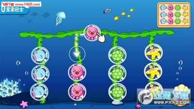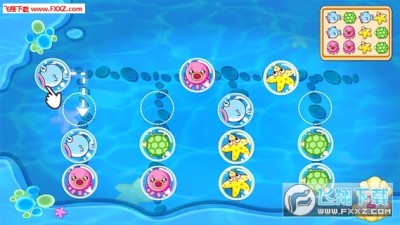 宝宝移泡泡,是一款培养宝宝分析能力和思维逻辑能力的益智小游戏。趣味十足的海底世界,活泼可爱的海洋动物,还有充满挑战的游戏滑道,需要小朋友们开动脑筋思考,根据左上角提供的参考图,将这些不同代表色的海洋动物移到正确的位置上就能顺利过关。