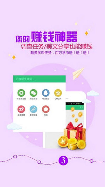 学生赚是国内第一个专门服务学生群体的手机威客平台。该软件在2013年8月发布登陆各大市场,1年就有500万用户,用户可以通过参与调查、威客接单、参加活动、每日签到等获得学币。新手用户登陆软件后只需要3分钟即可完成新人任务,就能体验学生赚的各种玩法:签到,摇一摇,分享赚学币,做任务赚学币,然后兑换QB,并且兑换后3分钟内到账。除了Q币,还能够兑换移动话费,联通话费,电信话费,支付宝充值,财付通充值等等。