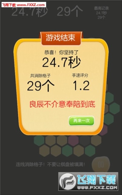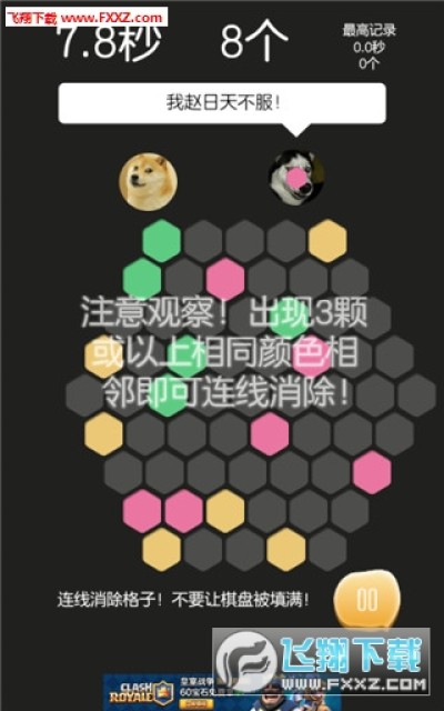 良辰大战单身狗安卓版是一款有点魔性的六边形消除类手游,虽然良辰大战单身狗安卓版的核心玩法是消除,但是在屏幕上方会有2个狗头,它们会不断的向下方的六边形格子里添加不同颜色的多边形,而你必须用最快速的方式连线相同的格子来进行消除,一旦所有的格子被带有颜色的多边形给填满,代表着游戏的结束哟!