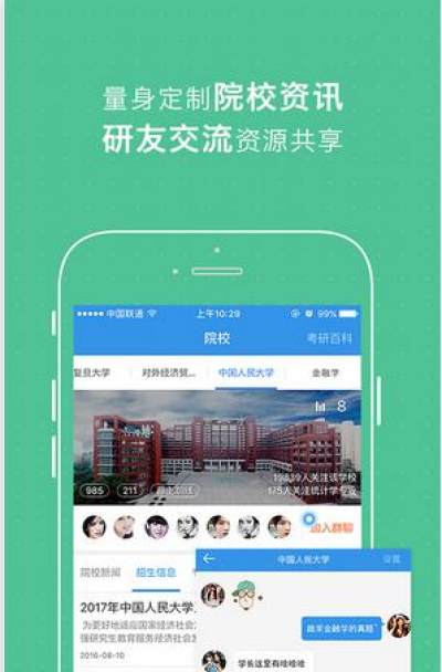 同一个学校专业,同一个梦想,群聊等你上线来撩,随时勾搭研友互动分享交流心得,考研路上再也不用孤军奋战!