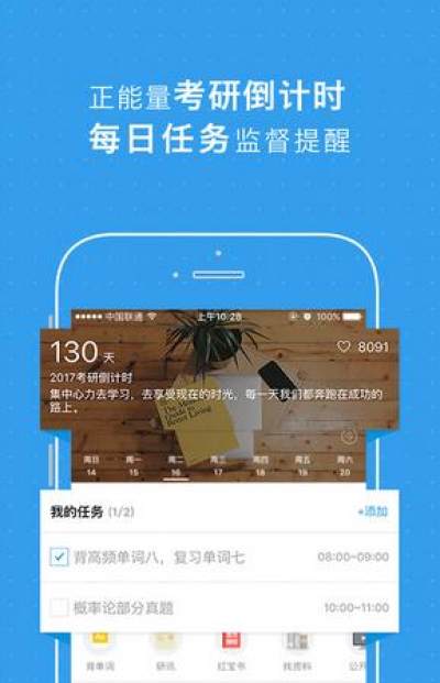 考研倒计时+鸡血正能量,带来动力满满,印证你的考研每一天,定制专属的每日任务清单,专门拯救拖延癌晚期患者,怎么能允许考研的你偷懒!