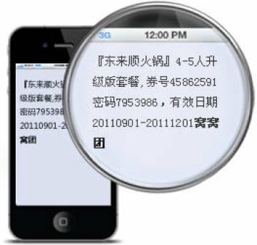 带有“窝窝团”字样的消费短信是您的消费凭证。购买成功后,在“我的窝窝”中的“我的订单”找到自己支付的订单, 点击查看,在对应的窝窝券右侧点击“发送短信”,输入接受短信的手机号码,您就会收到带有“窝窝团”字样的消费 短信了。