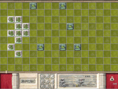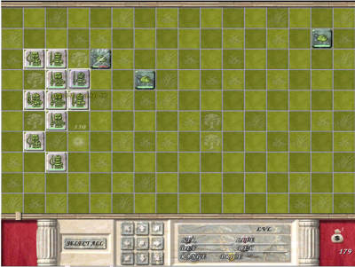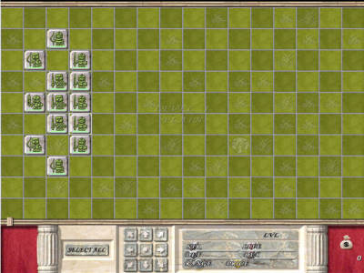 右下角是钱,有钱能使鬼推磨,双击敌人石板就可以购买下来。钱左边是属性面板,各属性稍后解释。再左边是移动按钮,点击箭头就可以让选择的单位按照按钮所指的方向移动一格。貌似每移动一次消耗一个回合。另外,移动也可以由键盘完成,“s”和“5”都是原地不动,旁边的八个键分别对应8个方向。“select all”是选择你的全部石板。