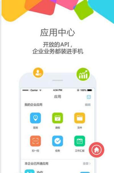 应用中心:提供任务、请假、审批、工作日志、公告、会议通知、投票、问卷等丰富的工作应用;提供开放的API,可连接企业现有业务(ERP)。