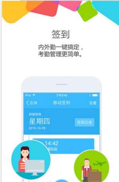 签到:多种签到方式精准定位;智能管理内外考勤,统计工时、迟到早退请假等状态。