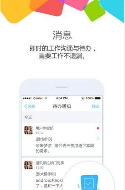 消息:支持单聊和群聊;消息已读未读查看,还可一键转任务;重要事项可@到人,还可短信通知。