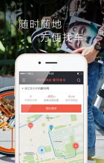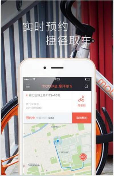 摩拜单车,触手可骑,打开手机软件,系统会自动定位并找到附近的可用车辆。预约成功后,界面上的导航图顿时消失了,显示单车所在的具体位置摩拜单车app半小时1元租车费,价格亲民