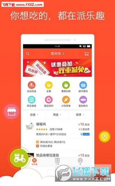 派乐趣app是一个功能强大的手机送外卖软件,这里的美食非常多,还有很多新鲜的水果,不管你想吃什么,只需在线下单便会有专人为你免费送货上门,十分的方便,喜欢在网上叫外卖的朋友必备哟!