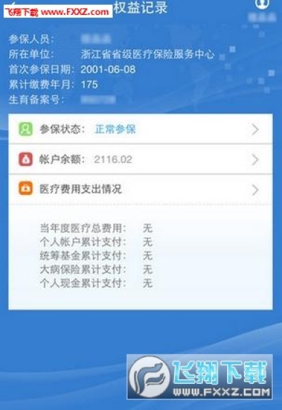 1、权益记录,可以方便用户随时随地能查询到自己的医保账户信息、缴费信息、消费信息等;