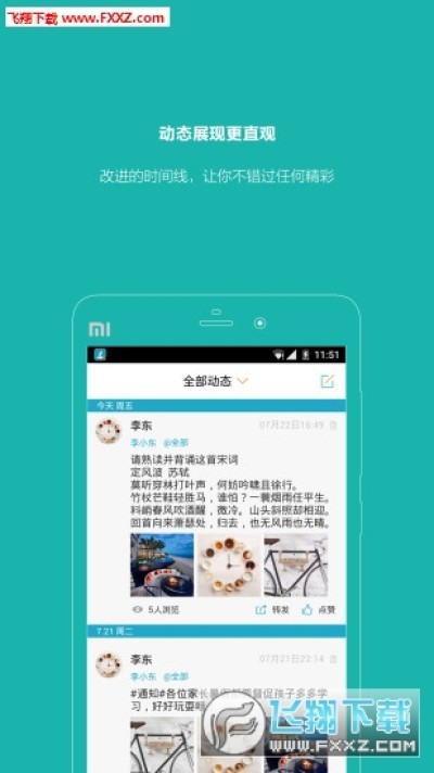 家长的种种担心,我们为您分忧:改进的动态时间线,像浏览朋友圈一样,查看孩子的实时班级动态。