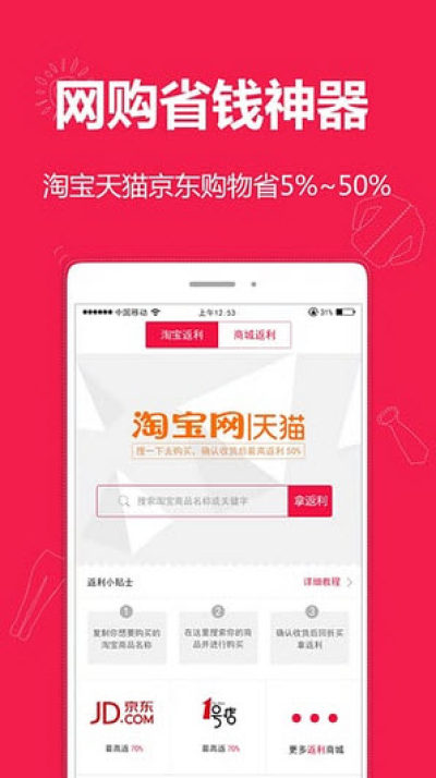 【商城返利】京东/天猫/唯品会/一号店/蘑菇街等300家商城购物,也有返利拿哦~