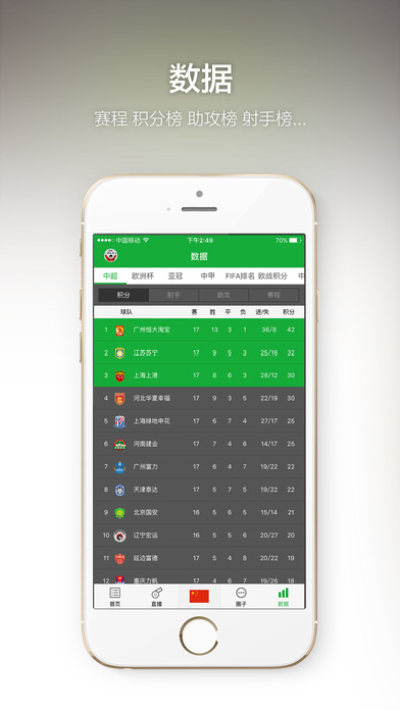 2.拥有国内最详尽的球员、球队、比赛等数据。你可以知道每名球员的动态甚至伤病史,知道每个球队的详细资料和赛程,甚至你也可以查看到诸如荷甲、德乙这样的联赛积分榜。