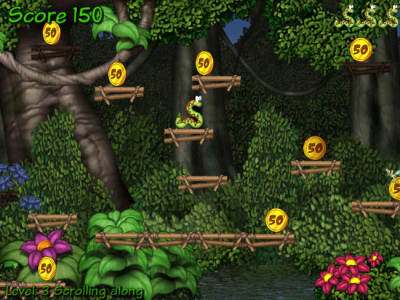 游戏的进行方式采用了独特的动作过关模式,和我们平时所接触的动作游戏有所不同。小蛇杰克要在快速的前进画面中,移动到高低起伏的台阶上收集金币,游戏充满了紧张的气氛。