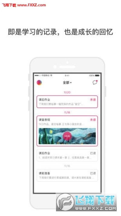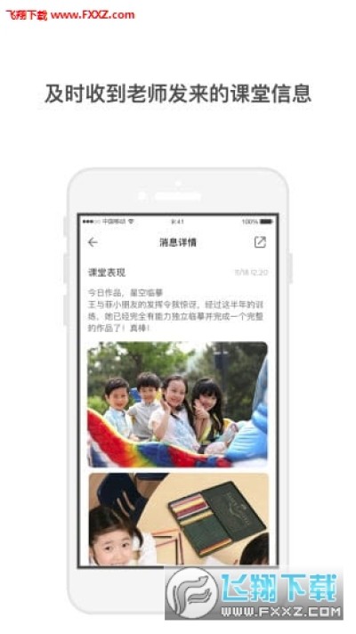 1.课堂消息,一目了然:家长只需添加孩子的课程码,即可收到老师发送的消息,可按通知、作品点评、课后作业等不同类型的消息分类查看,各种消息一目了然。