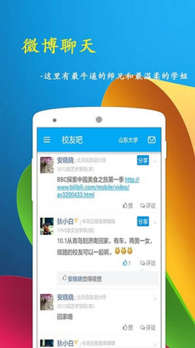 2.校友BBS:和校友交流招聘、创业、聚会、婚恋、职场等话题;