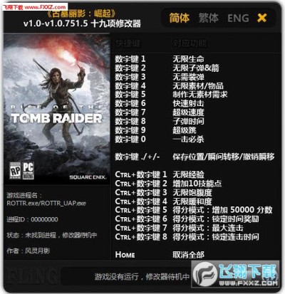 古墓丽影崛起v1.0-v1.0.751.5十九项修改器支持最新v1.0.751.5升级档,是由风灵月影大神制作并分享出来的,包含了无限生命、无限子弹、快速射击、子弹无CD等19项功能,安全稳定,欢迎下载。