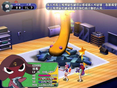 除了配点,玩家还可以在武器或防具上使用强化晶片来提升战斗能力。晶片分为提升战斗数值的“强化晶片”和增加辅助能力的“外挂晶片”二大类,“强化晶片”能够提升主角的战斗能力,“外挂晶片”则具有赋予属性、状态功能,例如KERORO这5名K隆星人都是需要湿气且惧怕乾旱的体质,当在游戏中遇到会吸收湿气的天敌NYORORO时,就可以在防具上镶嵌对抗乾燥属性的外挂晶片,有效降低NYORORO的伤害。