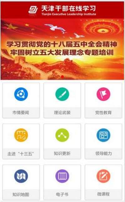 天津干部网络学院高举中国特色社会主义伟大旗帜,以邓小平理论、“三个代表”重要思想、科学发展观为指导,全面贯彻落实党的十八大和十八届二中、三中全会精神,深入学习贯彻习近平总书记系列重要讲话精神,运用网络和通信技术,整合优质培训资源,坚持科学管理、高效服务,满足干部日益增长的个性化、差异化学习需求,更好地为培养造就党和人民需要的好干部服务,为全面深化改革、建设美丽天津服务。