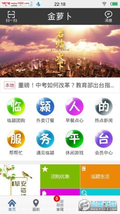 金萝卜app包含的功能有:团购、外卖、交友、找商家、找工作、招聘、找人、聚会、便民生活信息、临颍资讯、看天气、临颍汽车公交时刻表查询、临颍商家电话查询、快递查询、宽带缴费等。