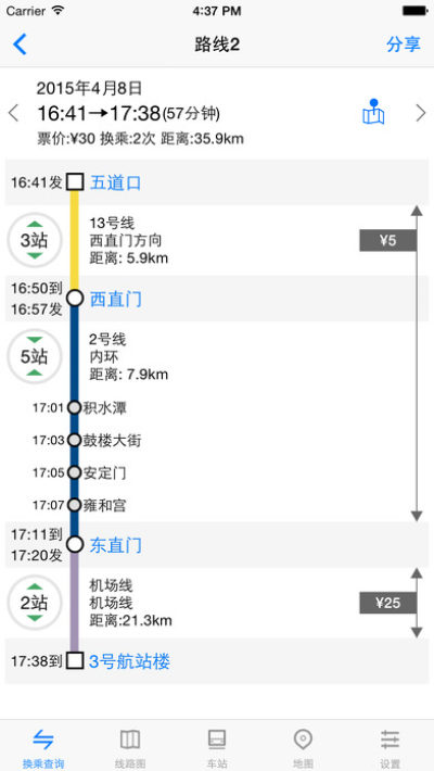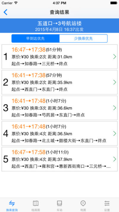 选择出发,到达,时间,即可获得多种换乘方案。包含:路线,时间,票价,距离。