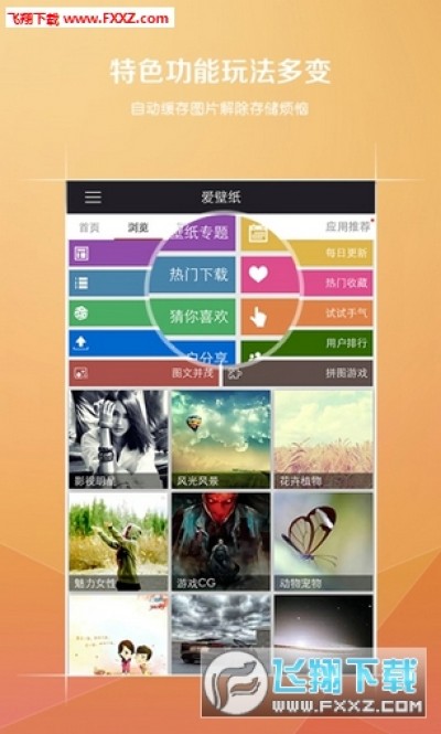 爱壁纸HD:专业的高清壁纸软件,一键更换,趣味玩壁纸!爱壁纸HD具有自动,手动裁剪功能,定时更换桌面壁纸,是个性秀的必备工具.爱壁纸HD能自动适配手机,平板,试手气,玩益智拼图,按颜色筛选壁纸等特色功能,会有小惊喜,万款高清壁纸期待您的选择!