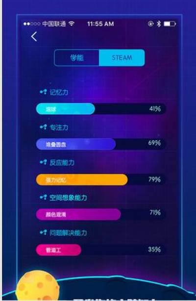 steam课程练习积累脑力值(根据学生学科练习结果反应到该学生的记忆能力、专注力、空间想象力、问题解决能力和反应能力五个维度哪块儿比较弱,并有有针对性的steam课程来开发该维度能力,并获取脑力值);